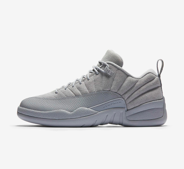 • Featuring a full Wolf Grey upper, this low top version of the Air Jordan 12 features a textured upper with leather detailing on the mudguard.
